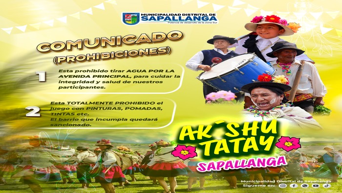 Los invitamos a ser parte de esta gran Festividad Agrícola que celebra nuestras tradiciones y cultura en la zona sur. ¡No te lo puedes perder! Ak'shu Tatay Sapallanga 2026!. VIERNES